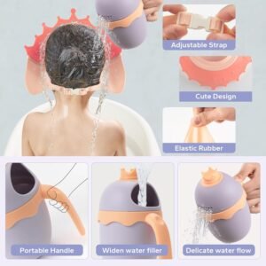 A baby shower cap is a bath time accessory designed to protect a baby’s head and ears from water and shampoo during bath time. It is typically made of soft, lightweight, and skin-friendly materials such as PP and TPE silicone. The cap is adjustable to fit different head sizes and can be used for babies over 6 months old.